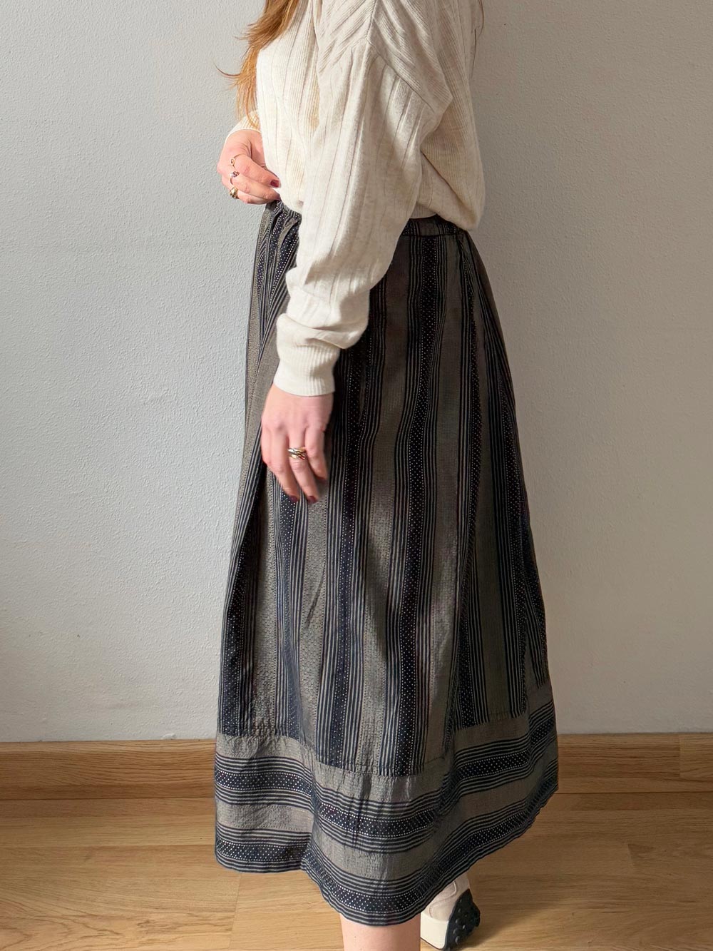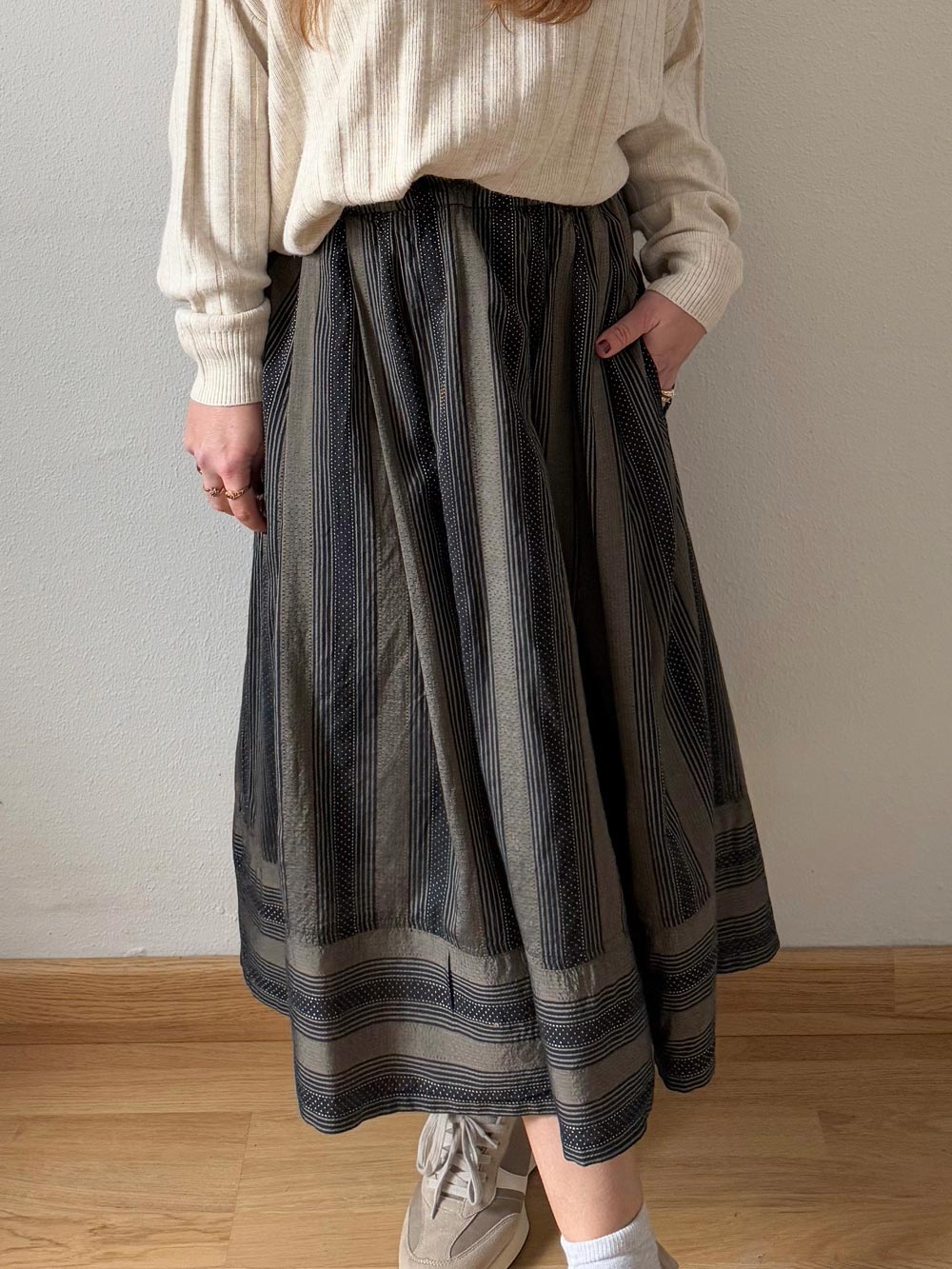 Falda estampada con vuelo fabricada en Alemania. Cintura ajustable con elástico y tejido con ligero satinado metalizado ideal. Lleva bolsillos
