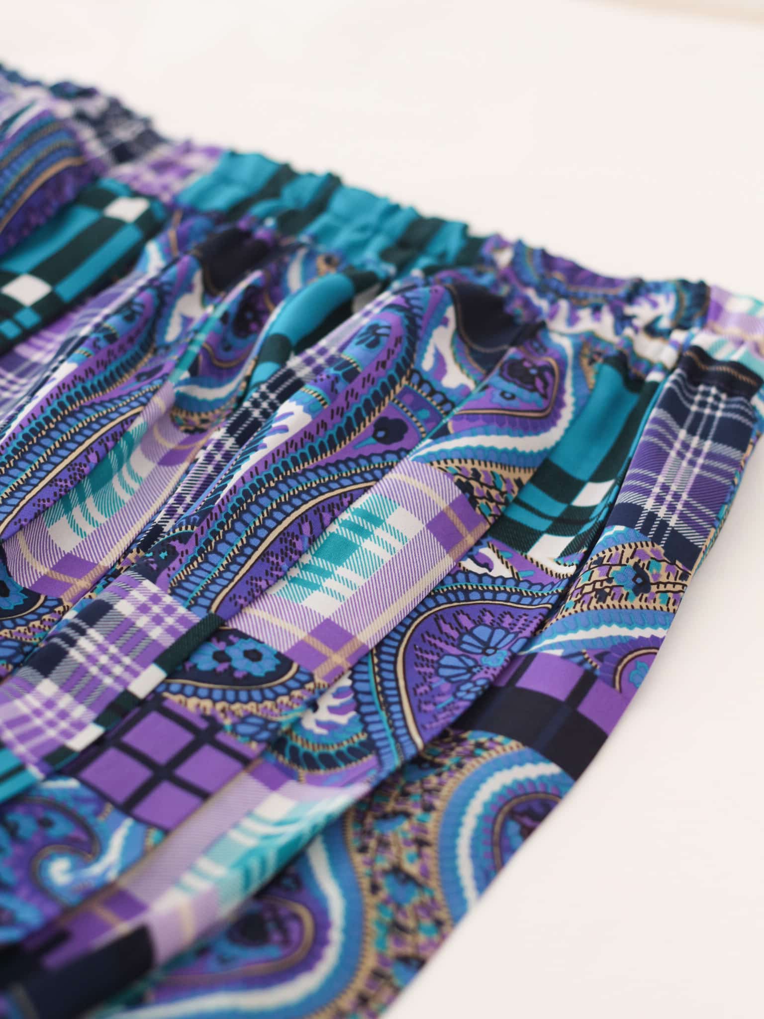 Falda con estampados geométricos y tonos azules y morados. Preciosa caída con gran fluidez.