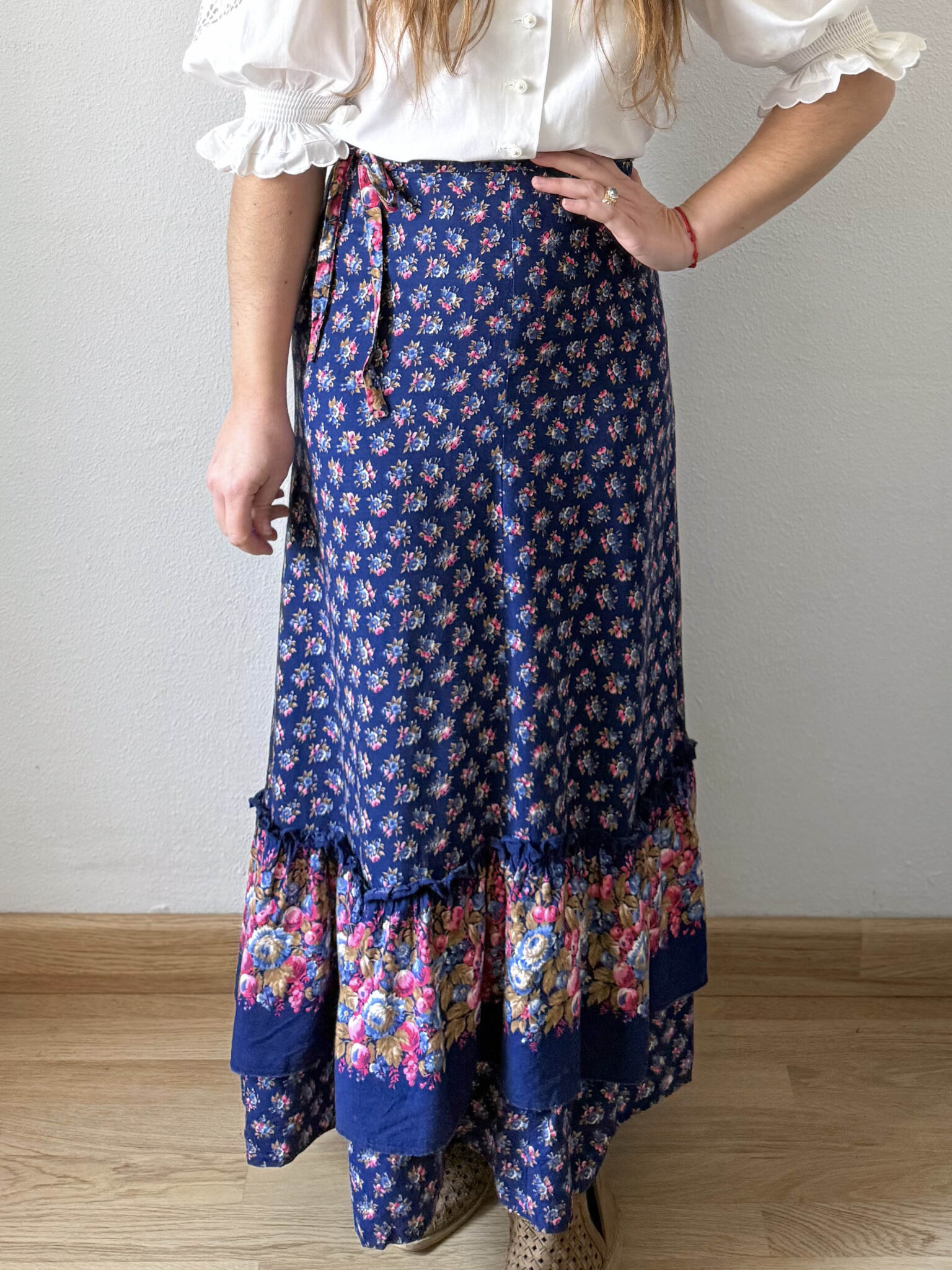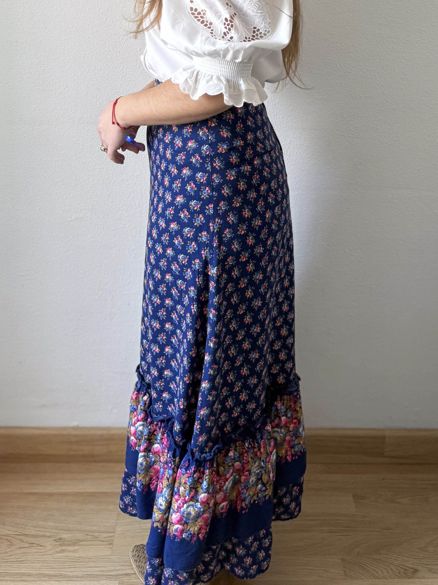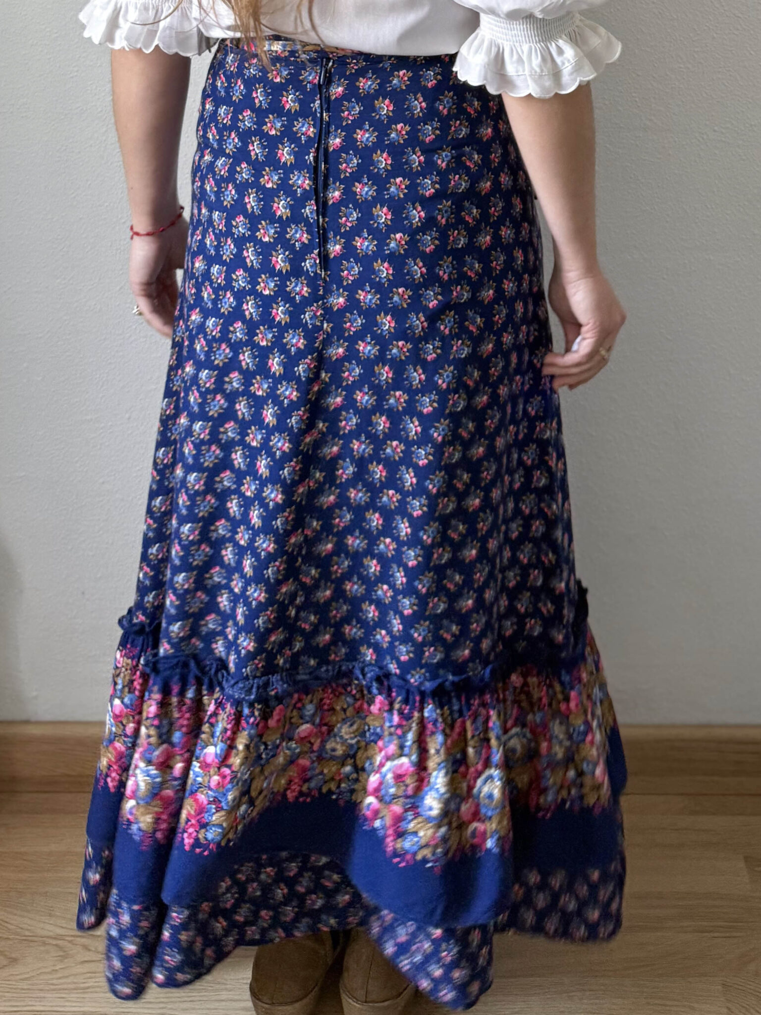 Falda volante 70s. Espectacular maxi falda larga original años 70 de tiro alto, silueta evasé y caída fluida con volante inferior. Cierre superior con cremallera. Precioso estampado floral en tonos azules, marrones y rosas.