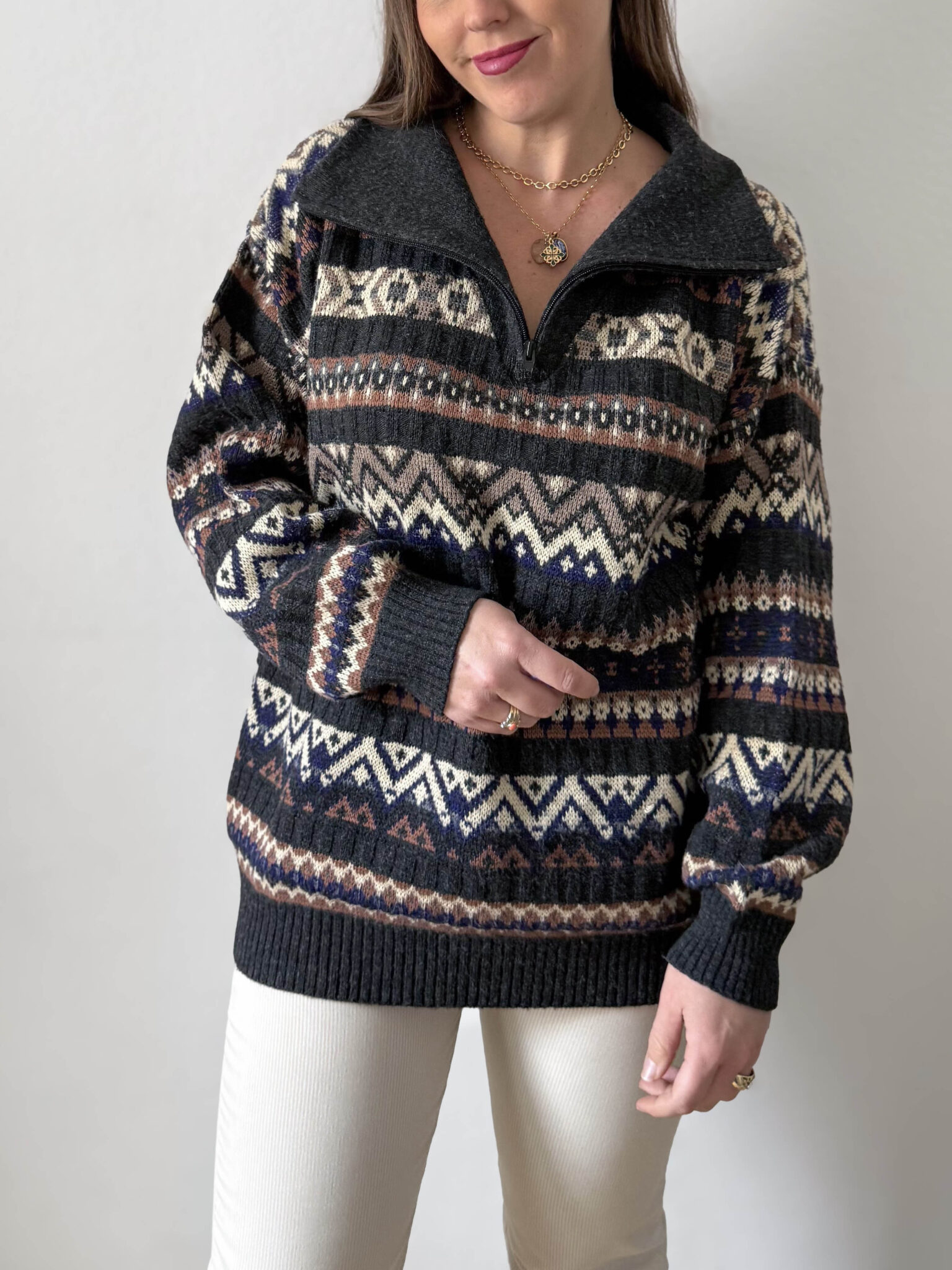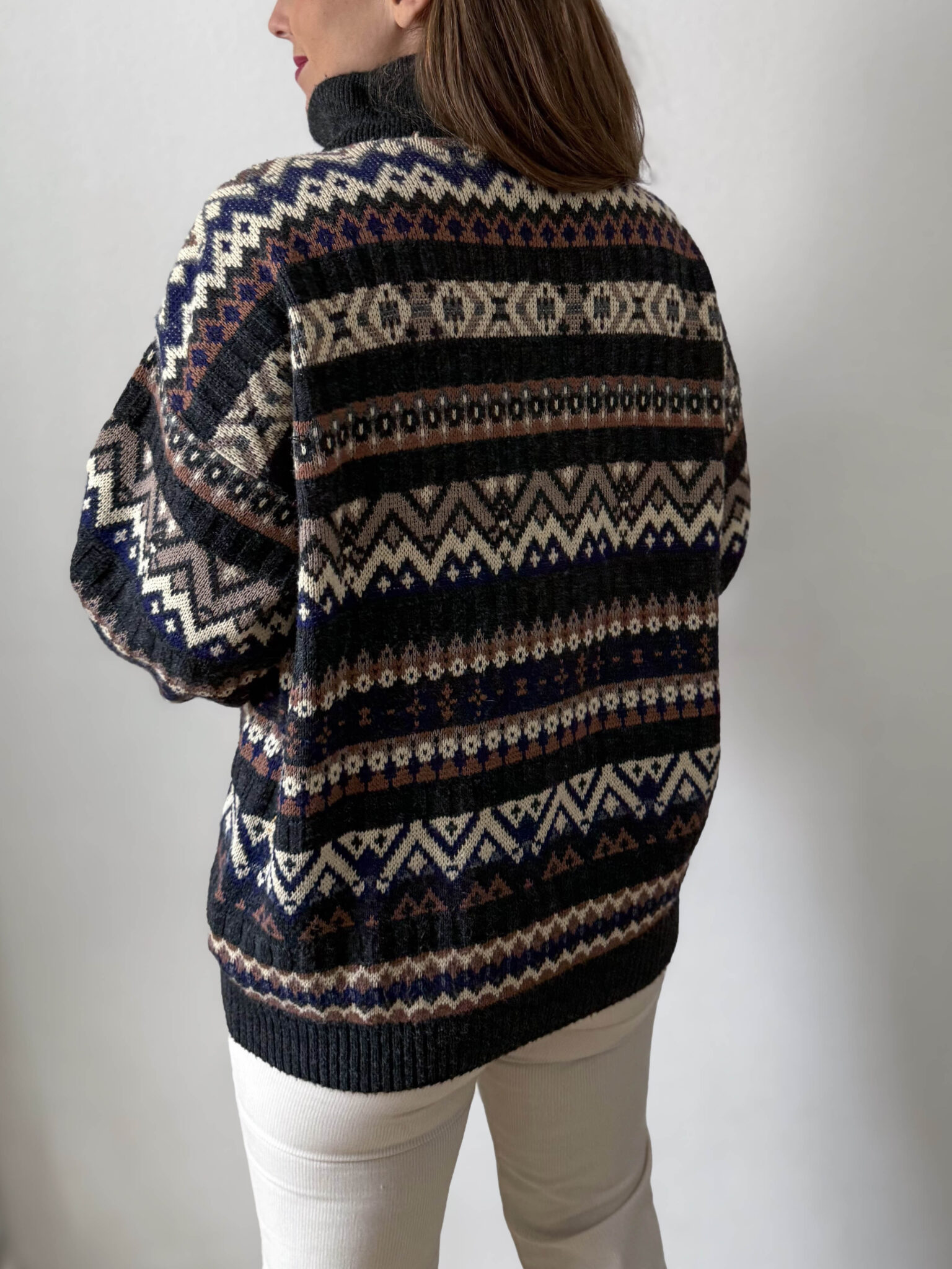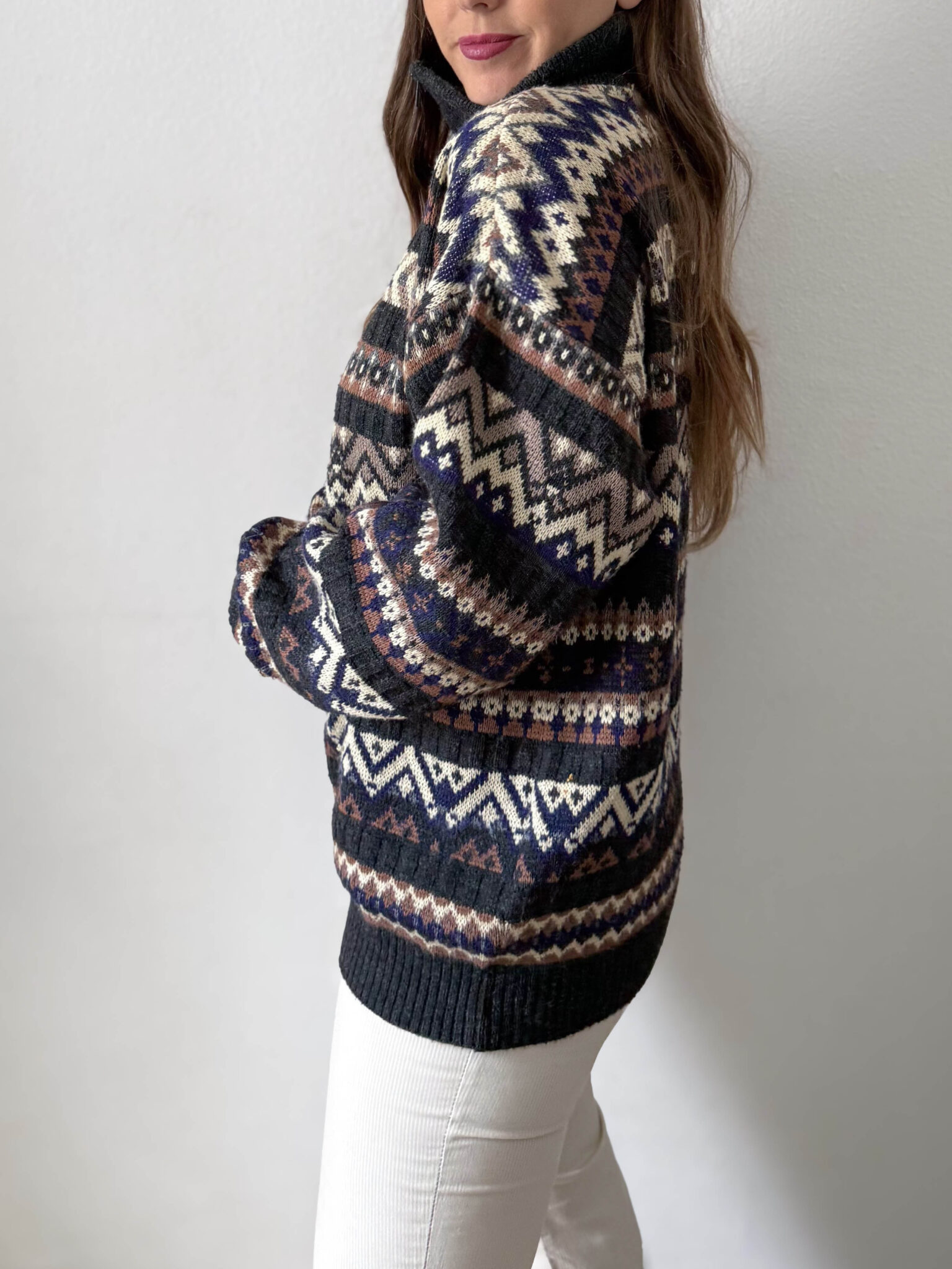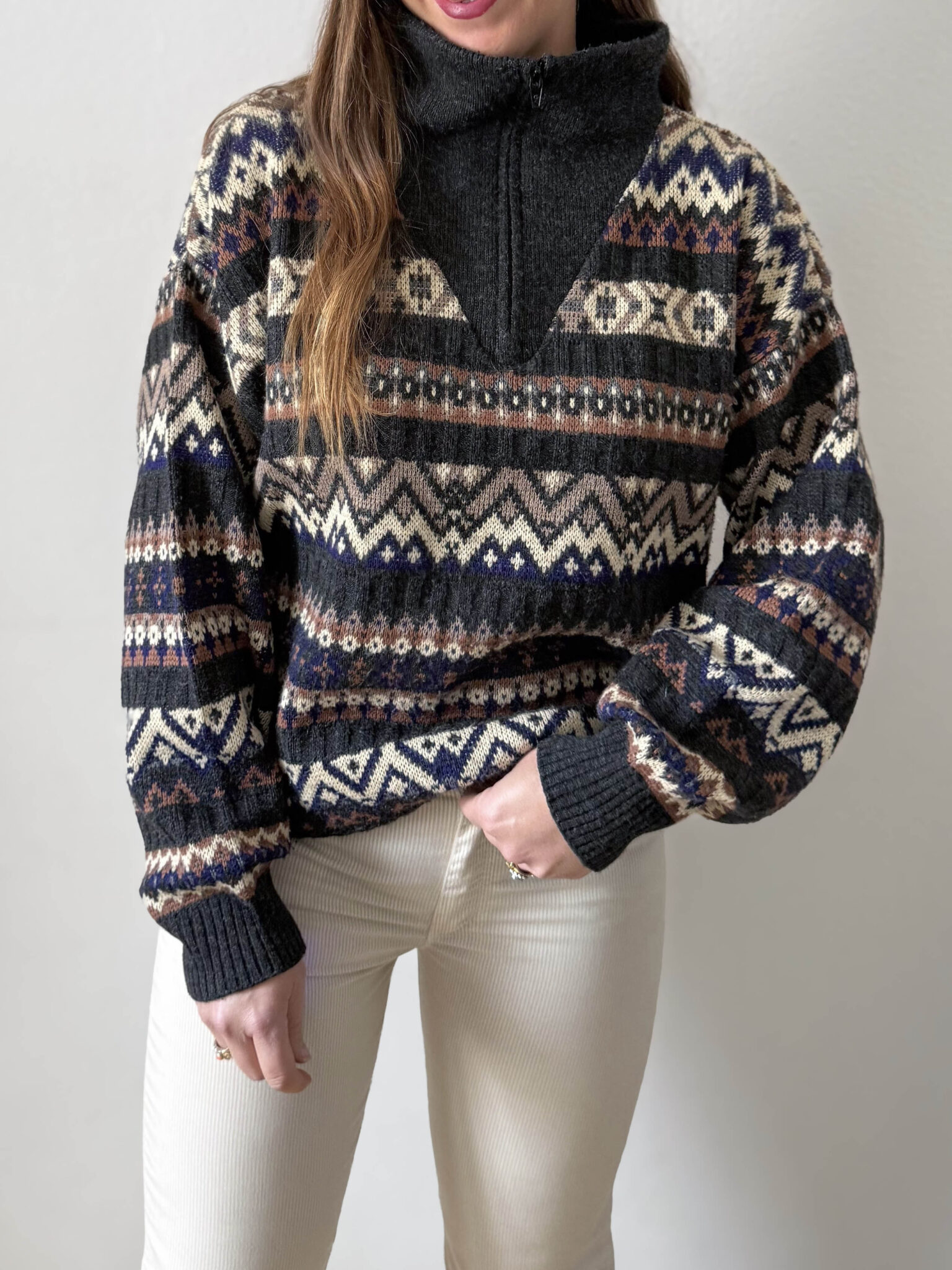Jersey cuello con cremallera y estampado geométrico en tonos grises, beige y azules. Corte overzize y cuello alto amplio. Prenda unisex