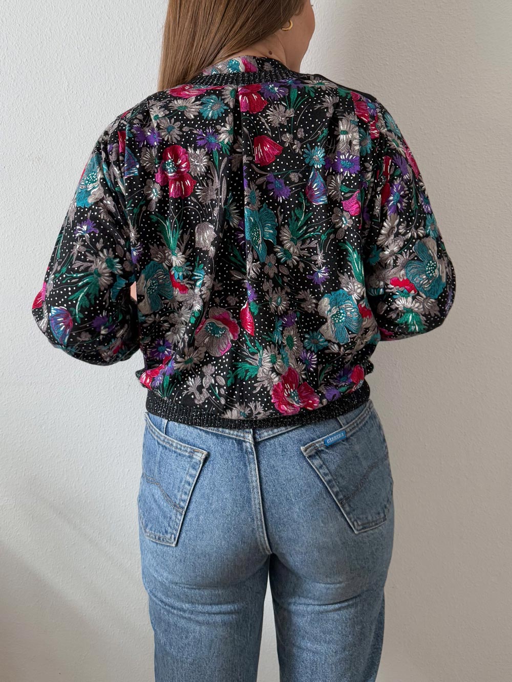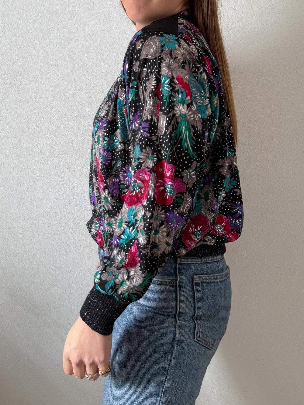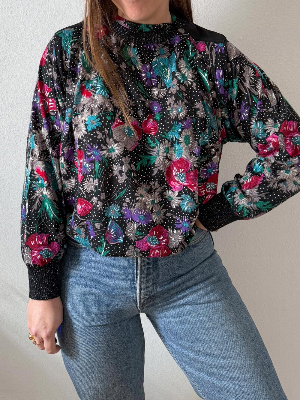 Jersey fino vintage muy original. Estampado floral con detalles metalizados. Cuello tipo mao con elástico y mangas murciélago de gran volumen.