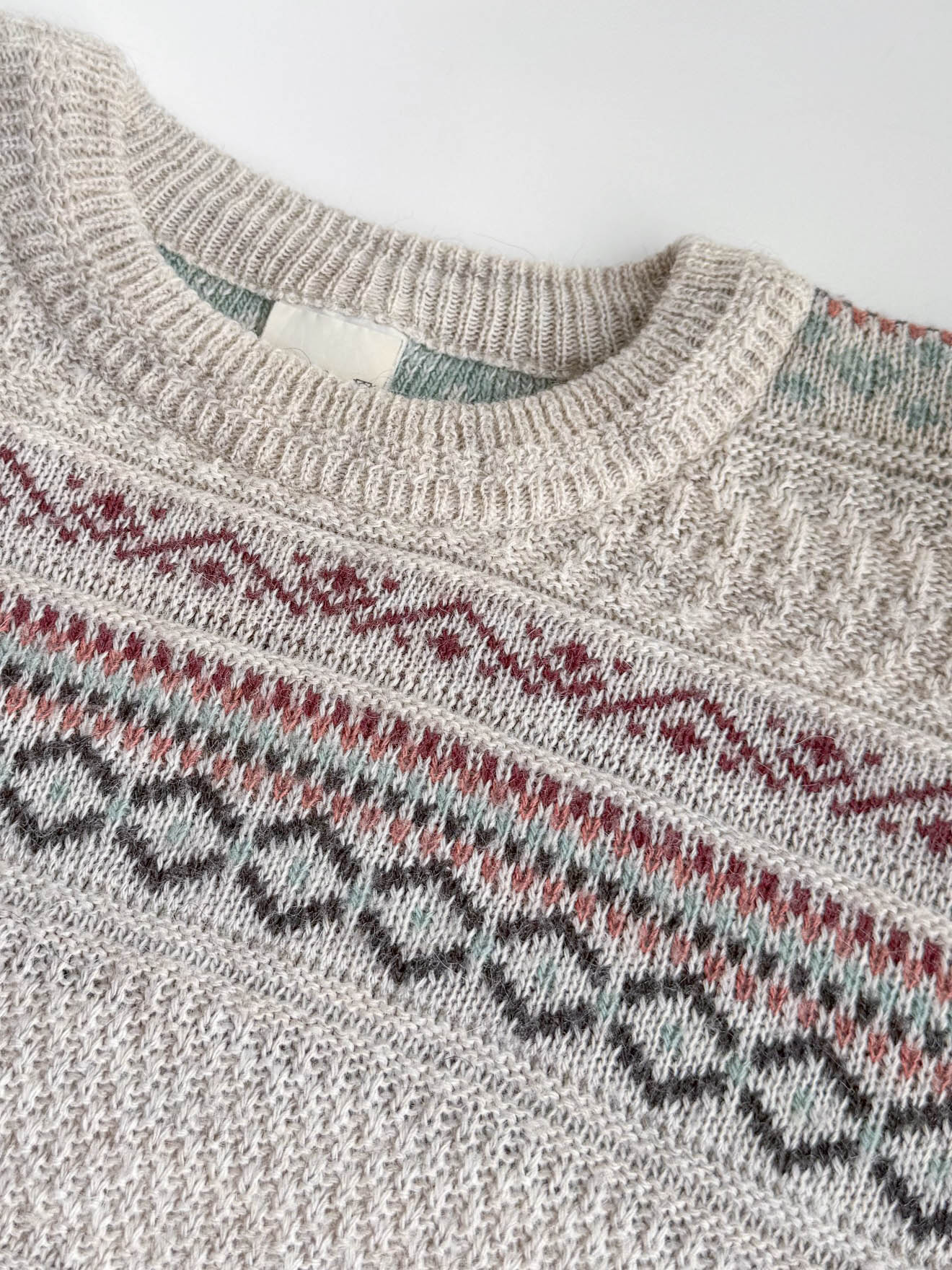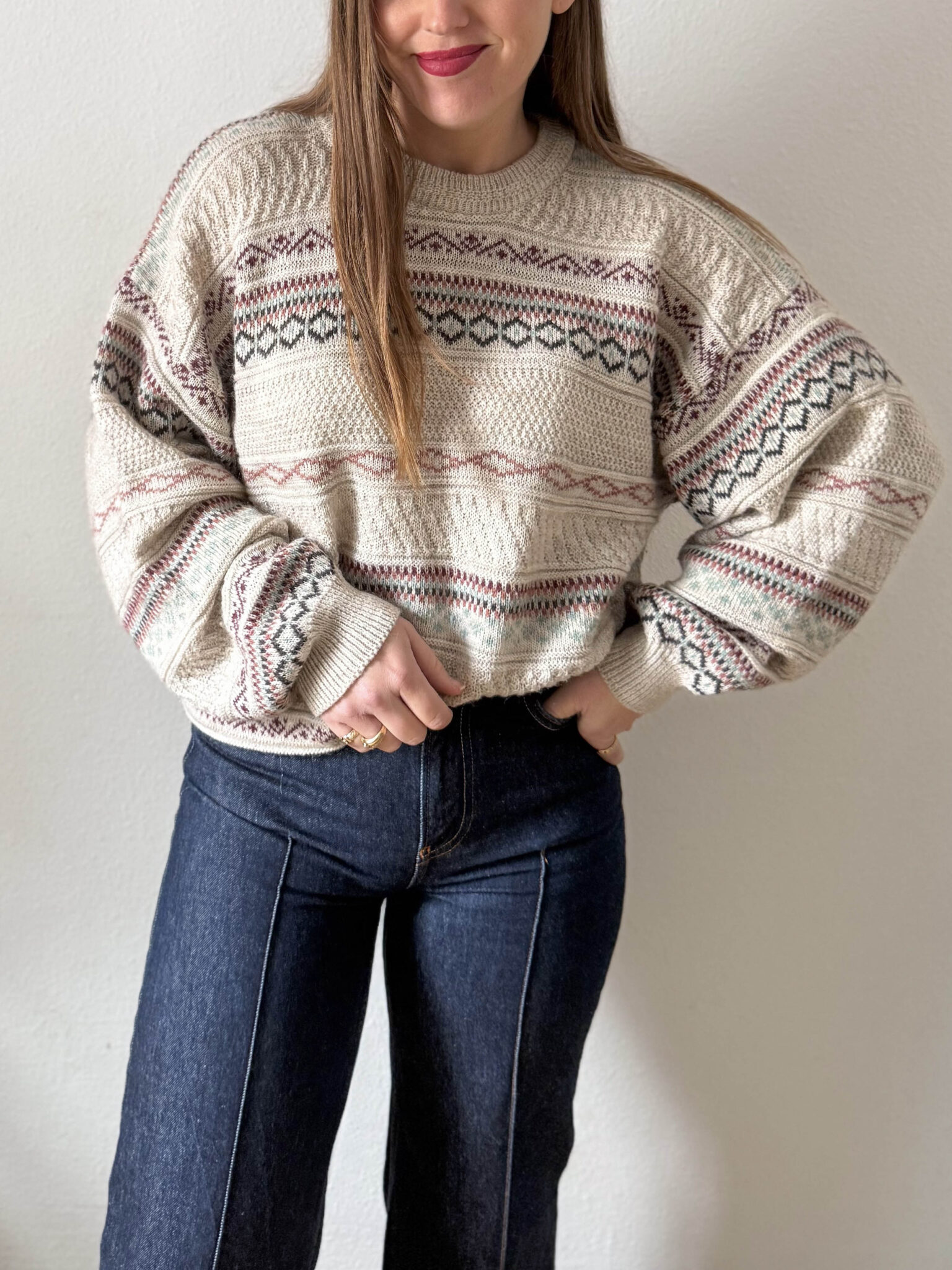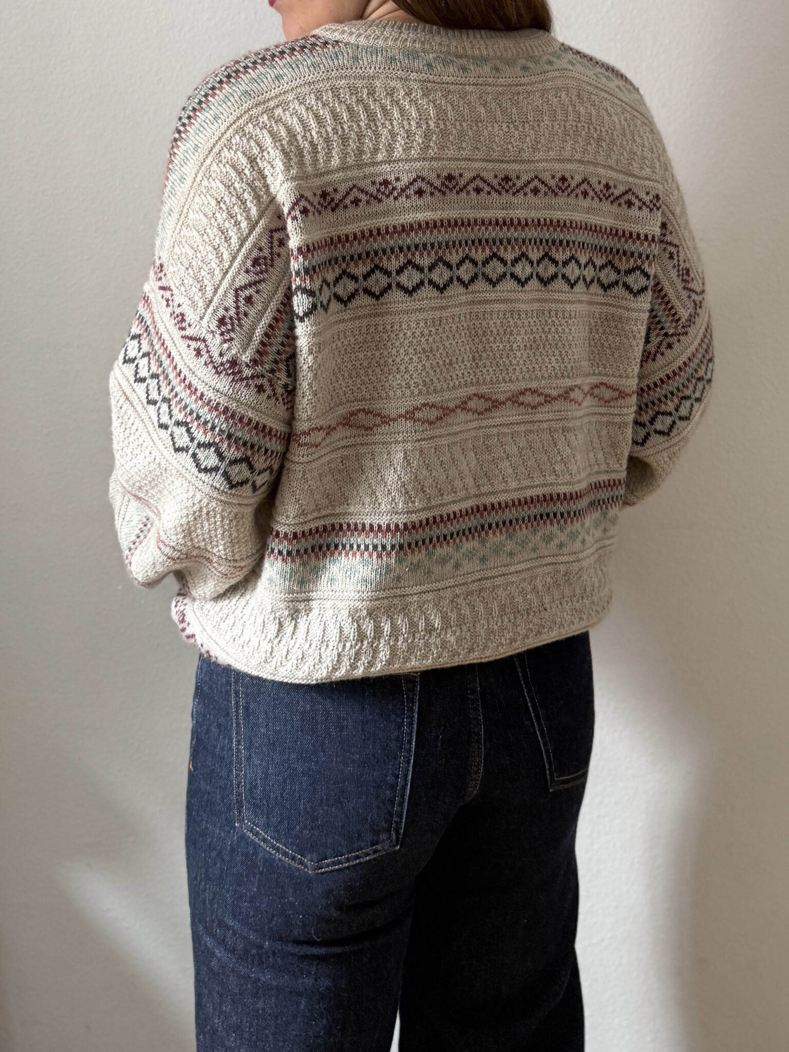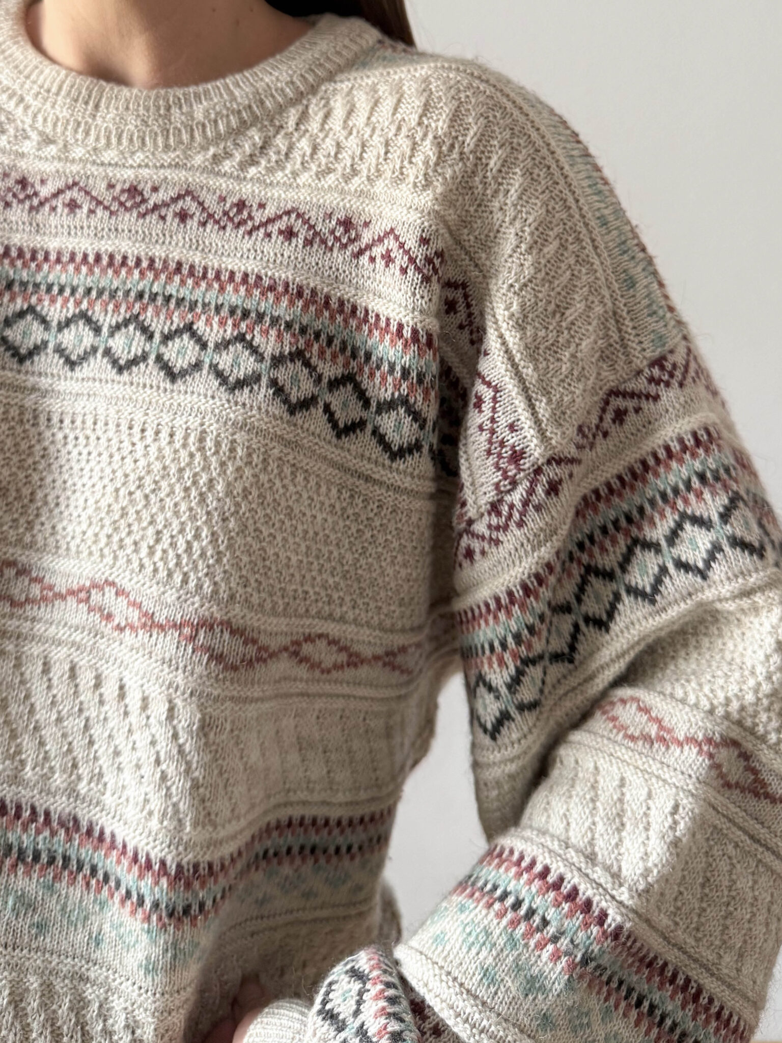 Jersey motivos geometricos de corte oversize. Modelo unisex, estampado geométrico horizontal en varios colores sobre fondo beige topo.