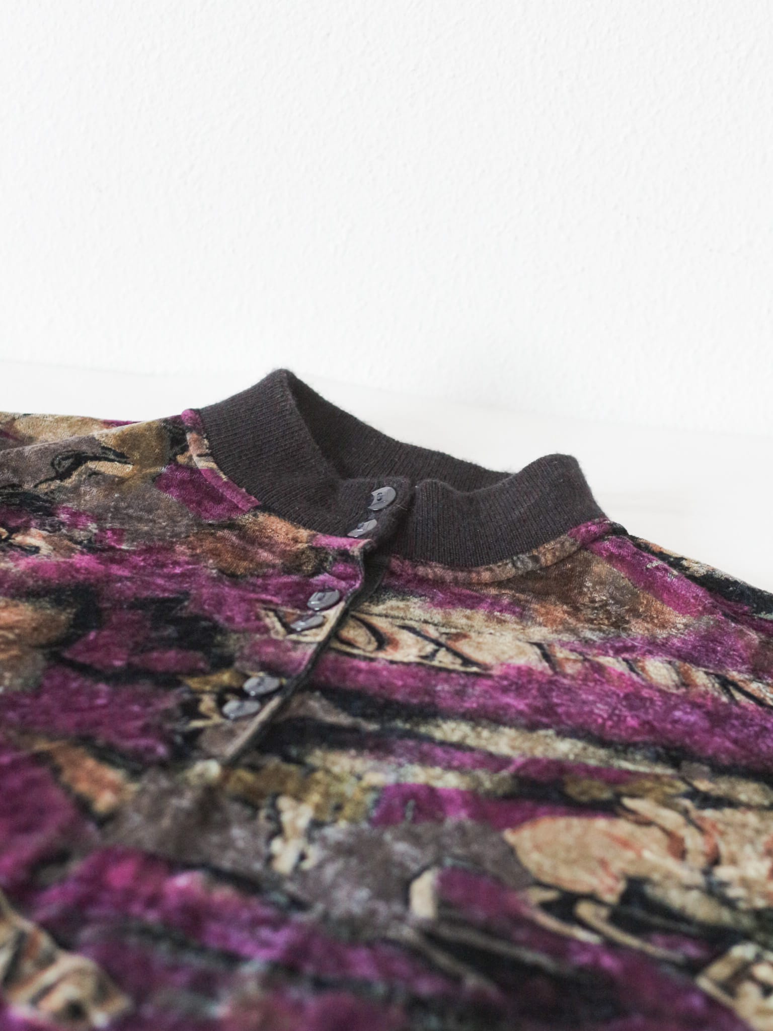Jersey en tejido velvet terciopelo con estampado abstracto en tonos malvas y beige.