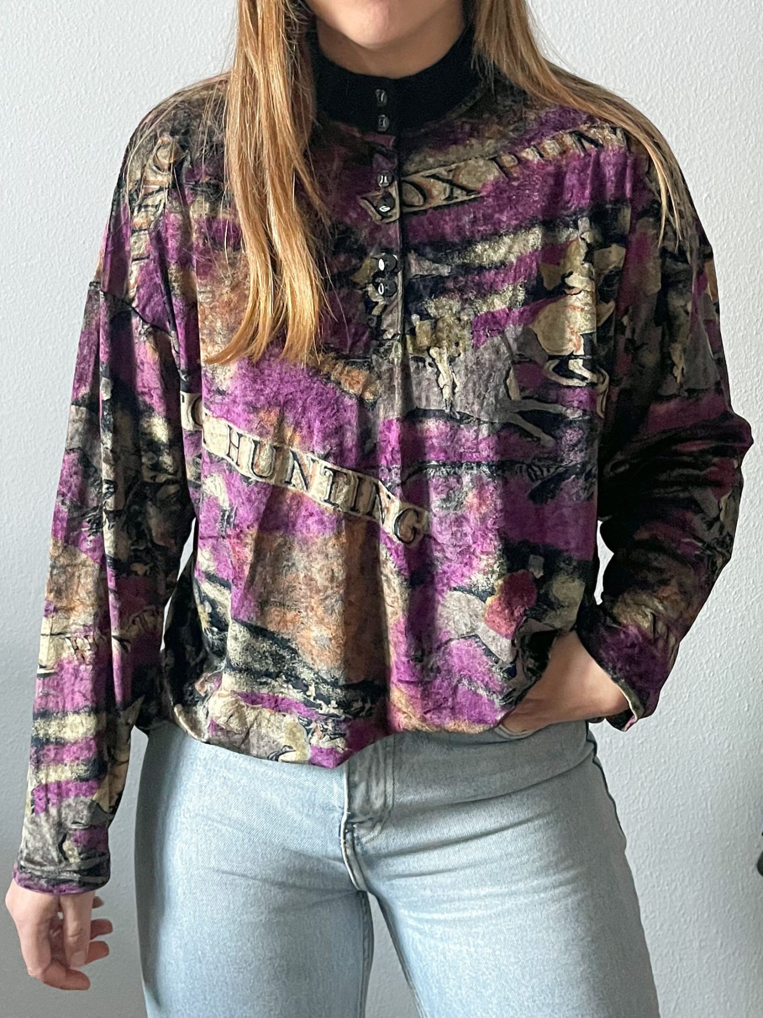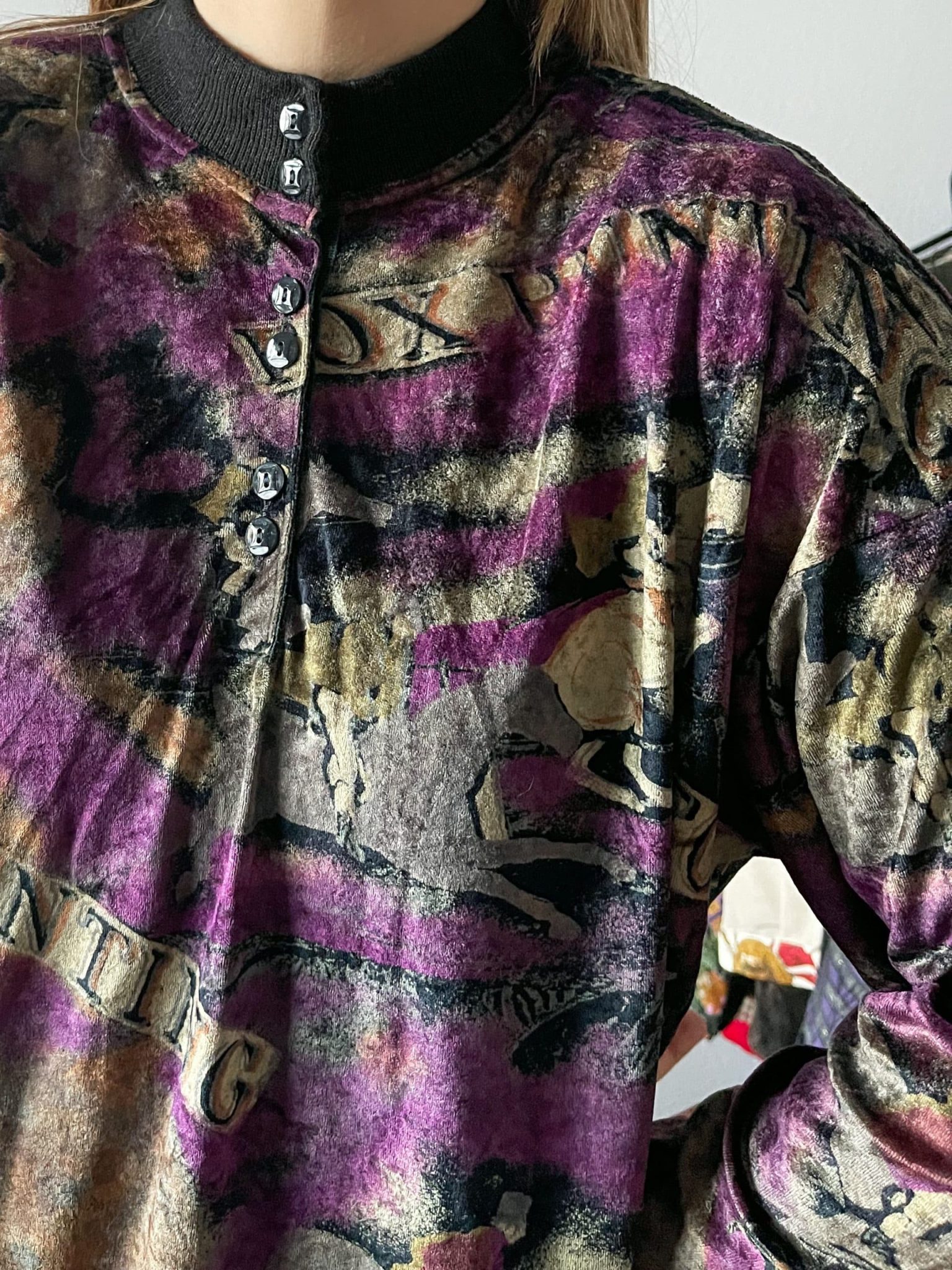 Jersey en tejido velvet terciopelo con estampado abstracto en tonos beige y malva.