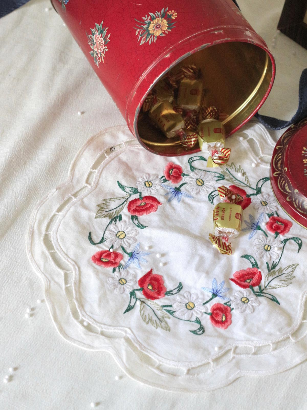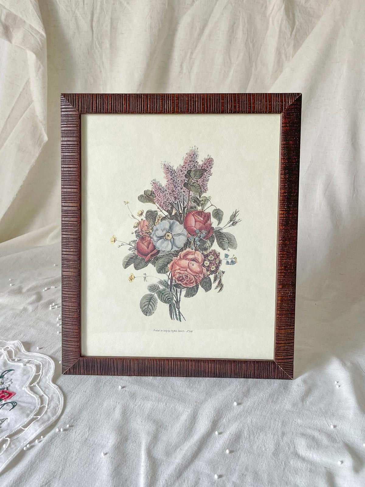 Posavasos bordado vintage, antigua ilustración floral enmarcada y lata vintage.