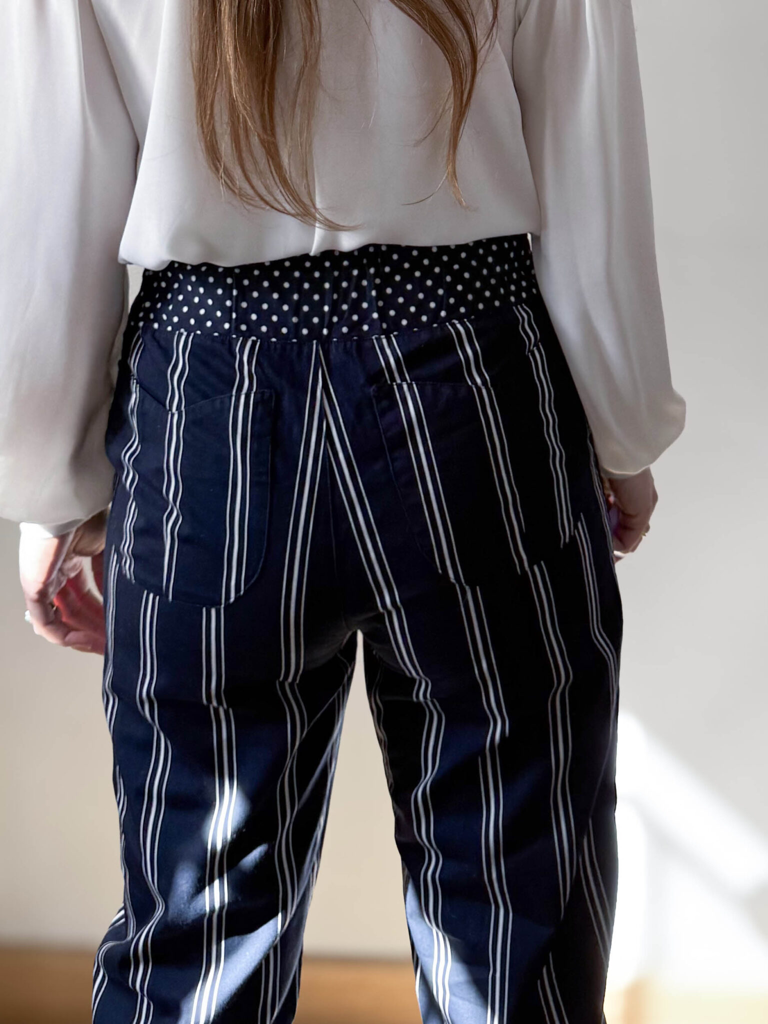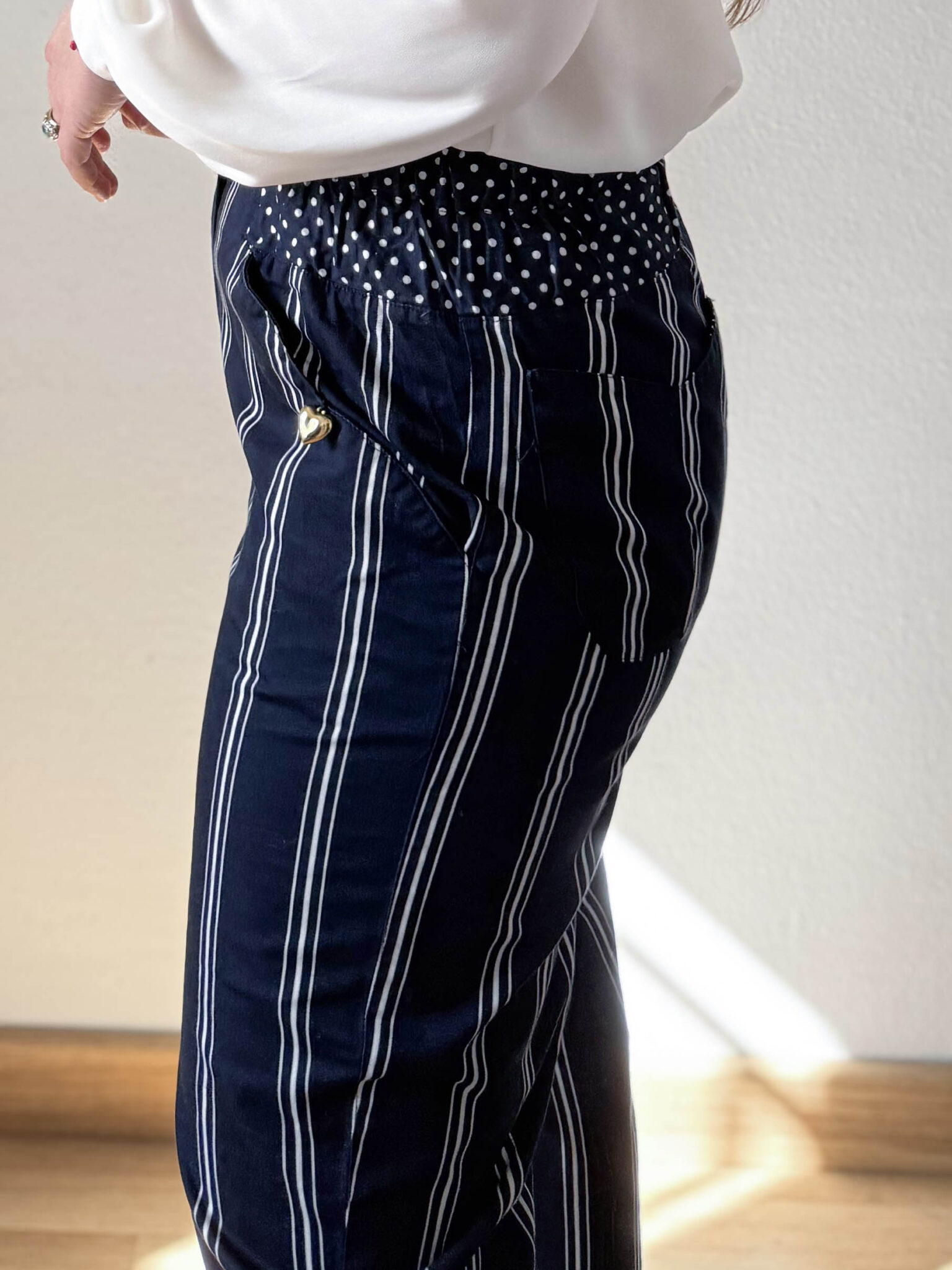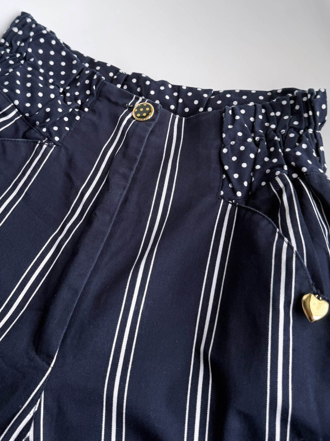 Contraste ideal de rayas y lunares combinables con un pequeño charm de corazón dorado en los bolsillos delanteros. Un pequeño detalle que hace de este pantalón una pieza más especial aún.