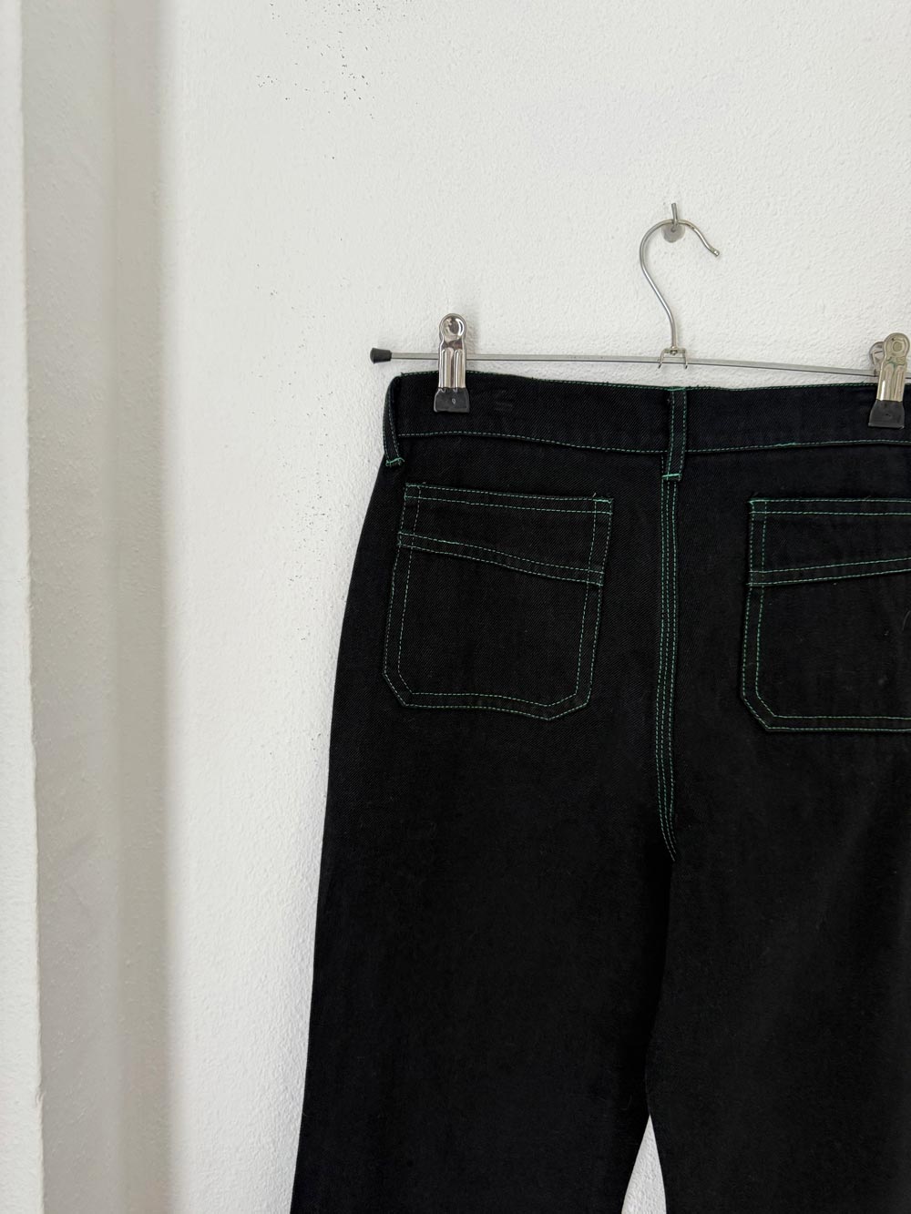 Pantalon pespuntes verdes tipo denim en color negro con detalles de pespuntes en verde. Bolsillos delanteros y pata ancha de campana.