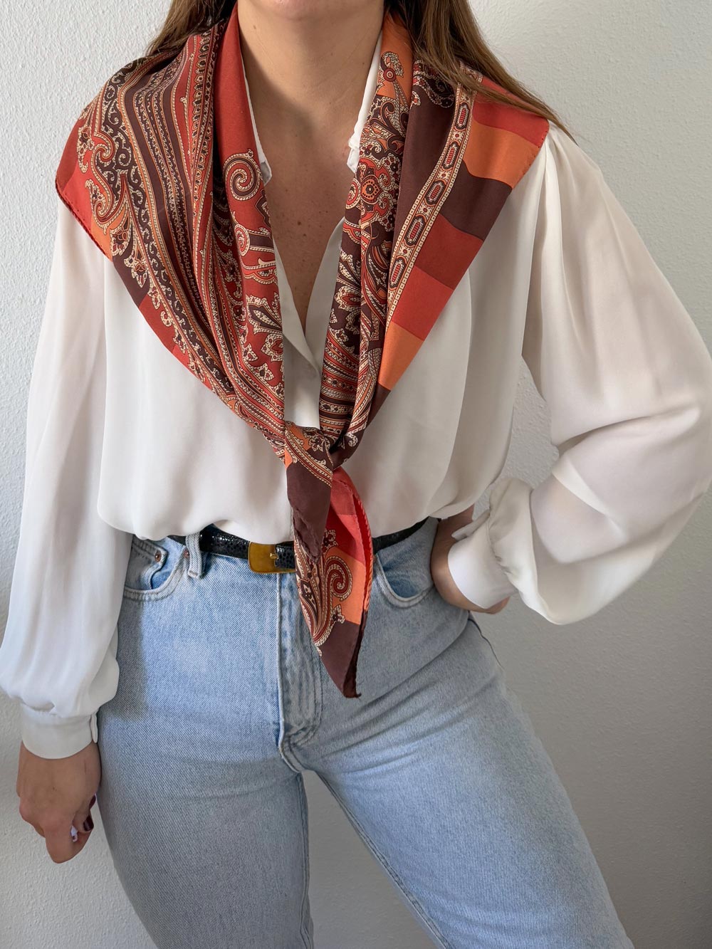 Pañuelo vintage modelo 4. Original pañuelo en tejido pura seda con motivos ecuestres combinados con detalles en paisley en tonos marrones y anaranjados.