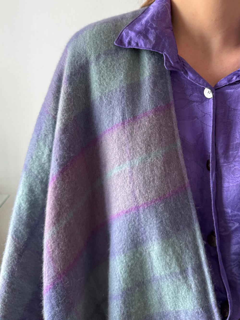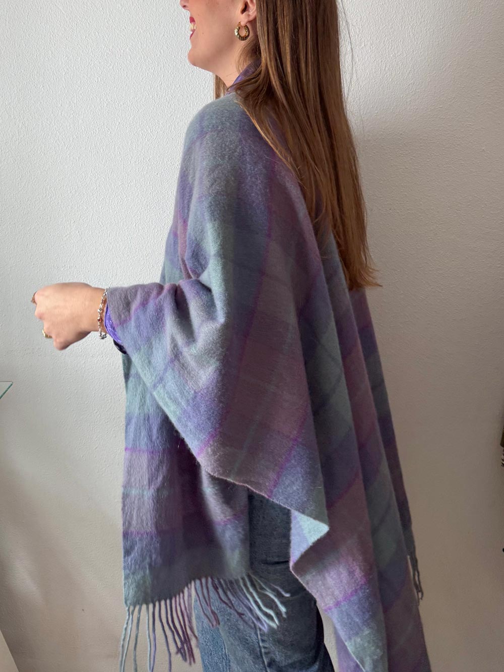 Poncho de cuadros con un contraste de color ideal. Malva, celeste y rosa. Queda abierto. Muy gustoso. No se puede asegurar si es 100% vintage.