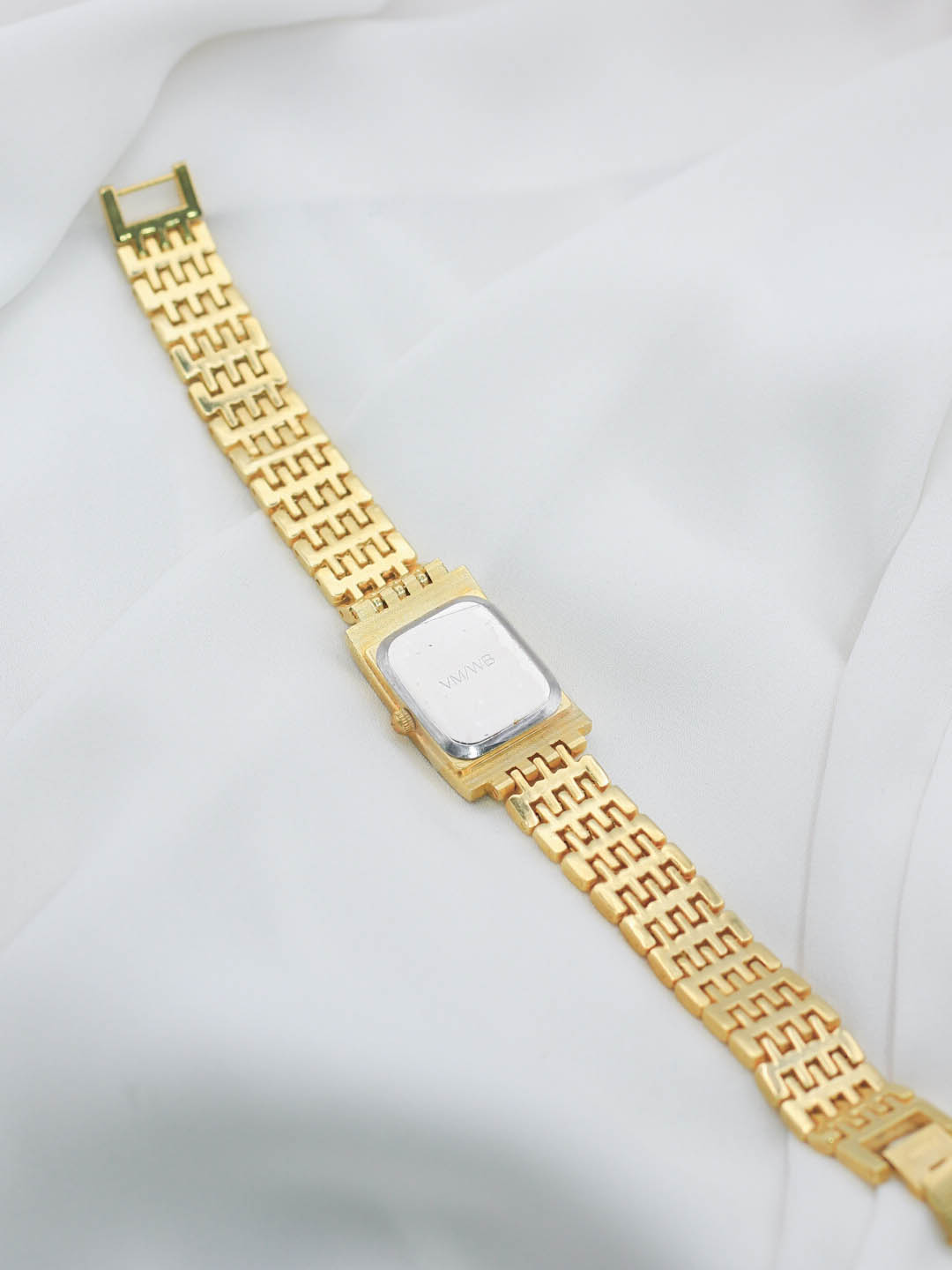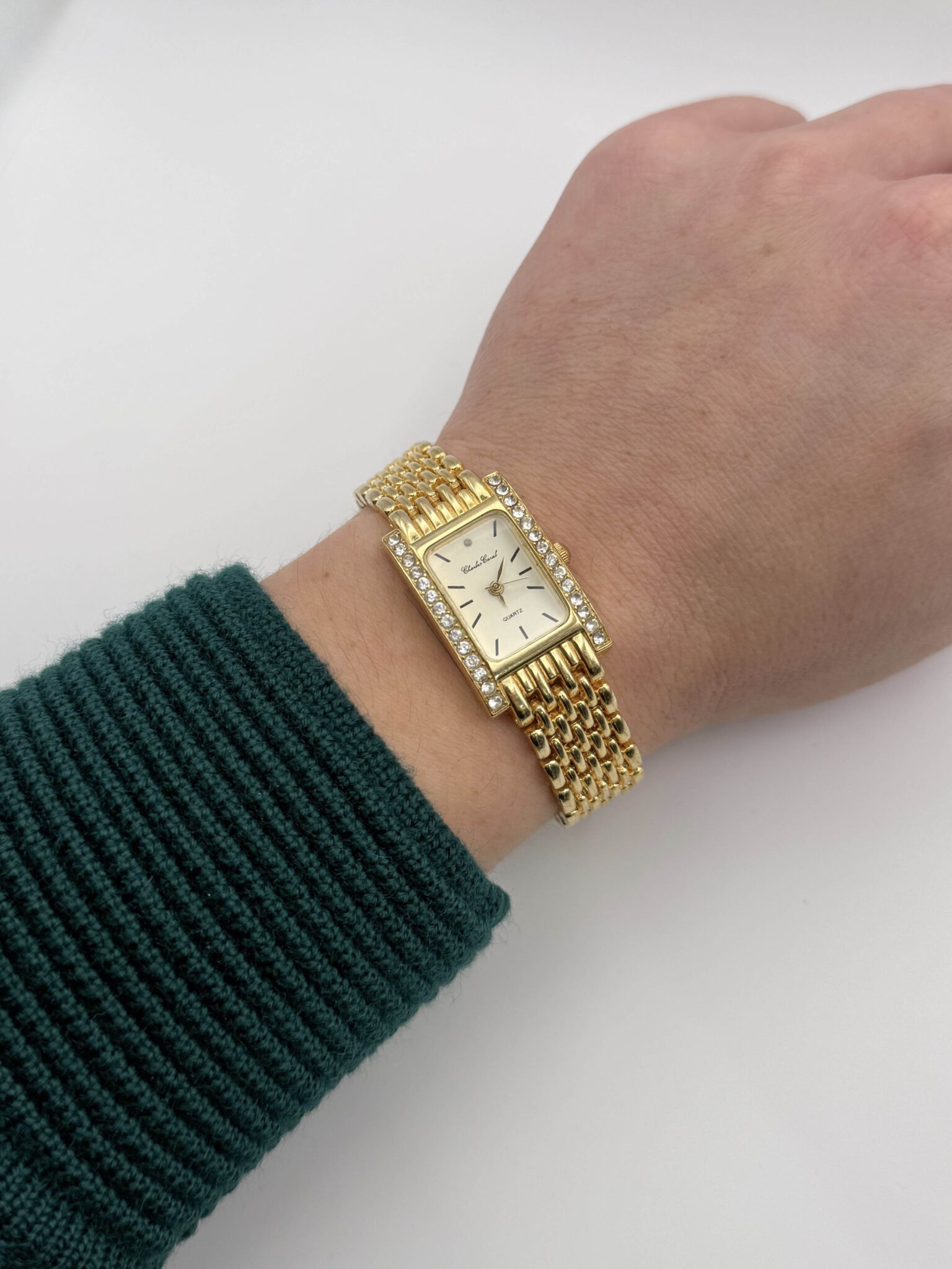 Reloj vintage modelo 3. Reloj de estética joya con caja rectangular decorada con hilera de cristales decorativos y correa metálica dorada.