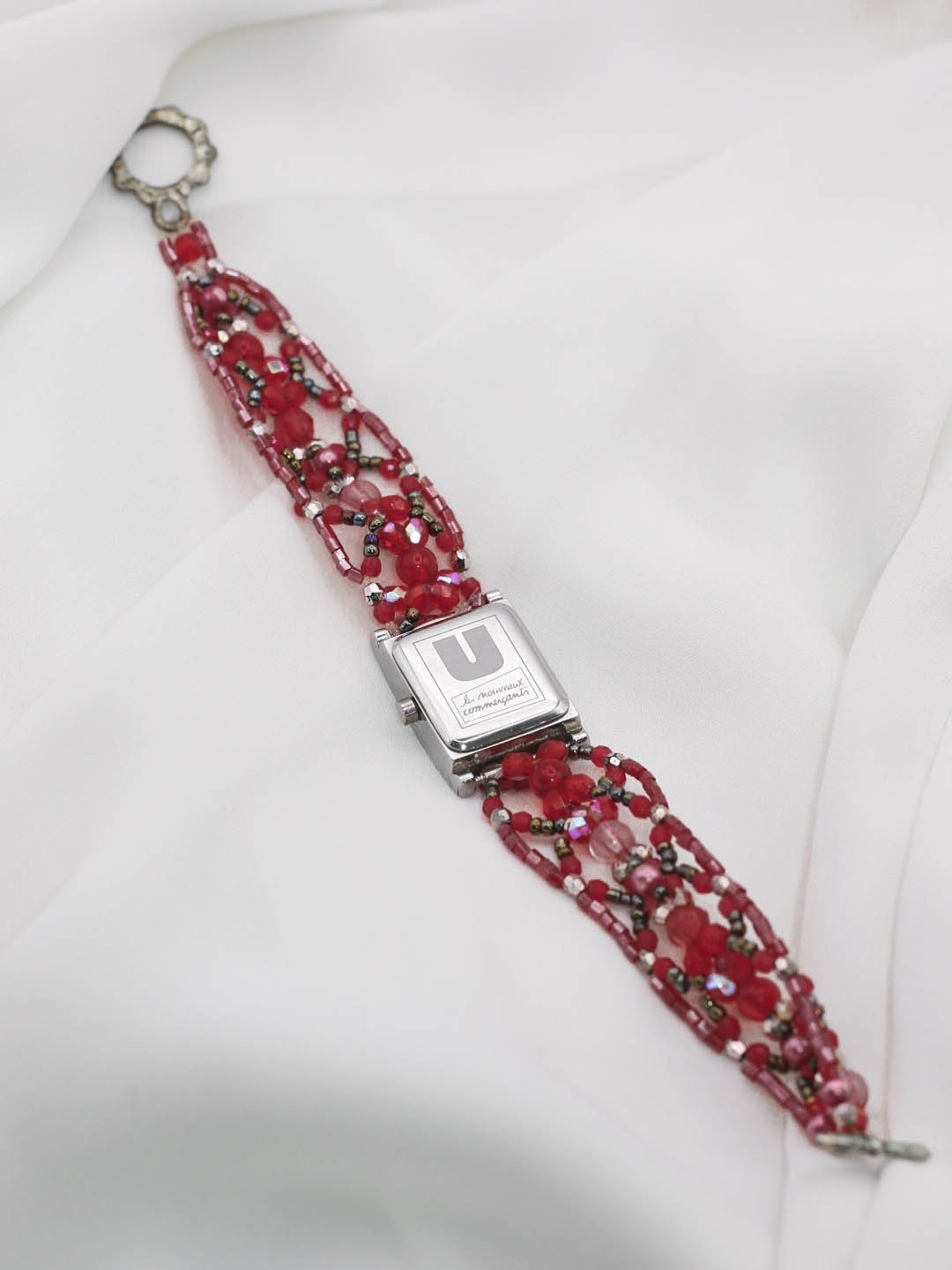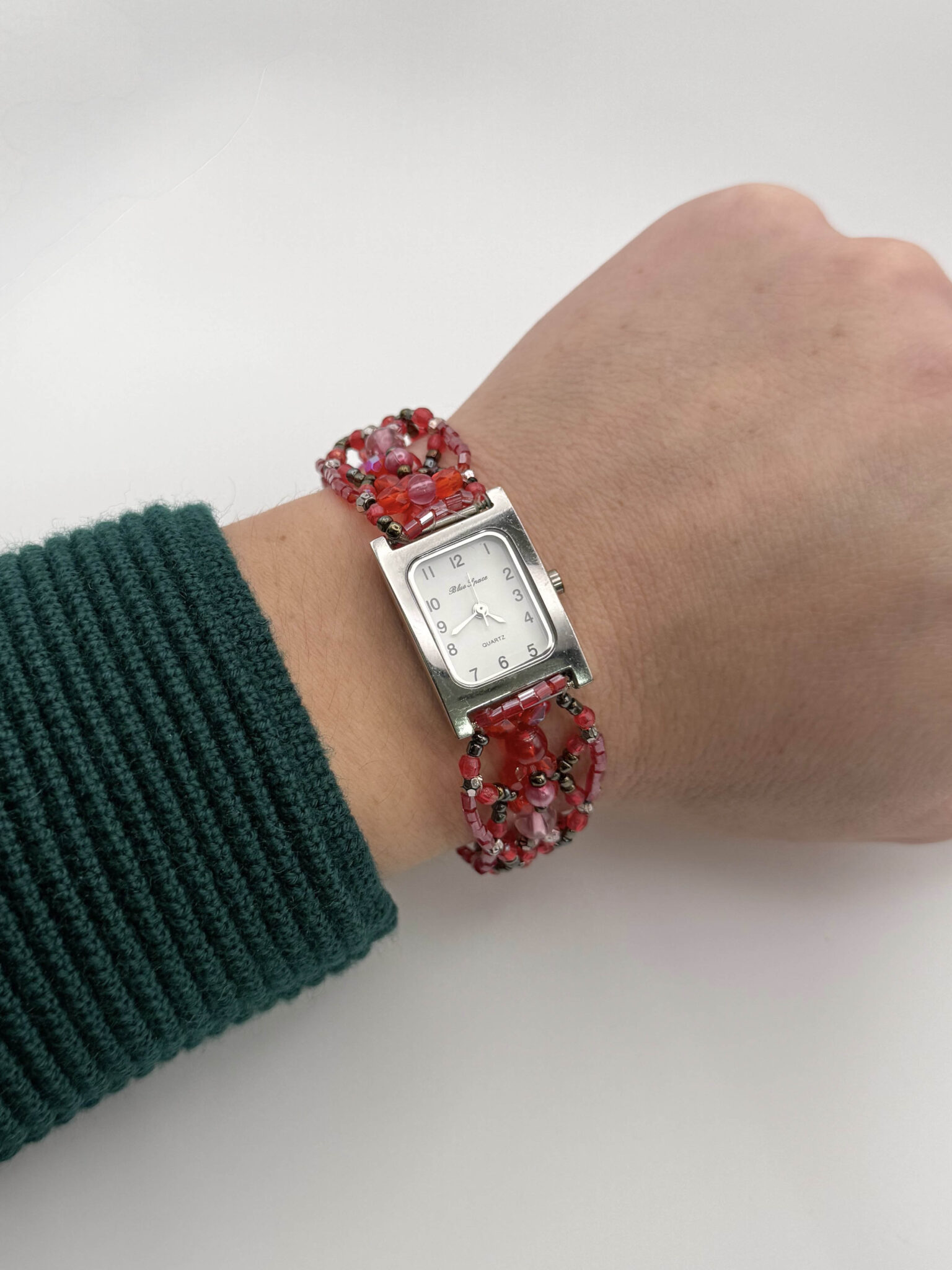 Reloj vintage modelo 6. Reloj años 90 con caja rectangular plateada y pulsera artesanal de cuentas y abalorios en tonos rojos y rosados. Ideal para muñeca de 18-19mm
