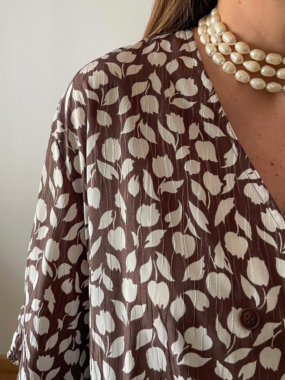 Vestido elastico satinado fabricado en España. Estampado en forma de hojas, color marrón combinado con blanco. Cintura elástica y escote en V
