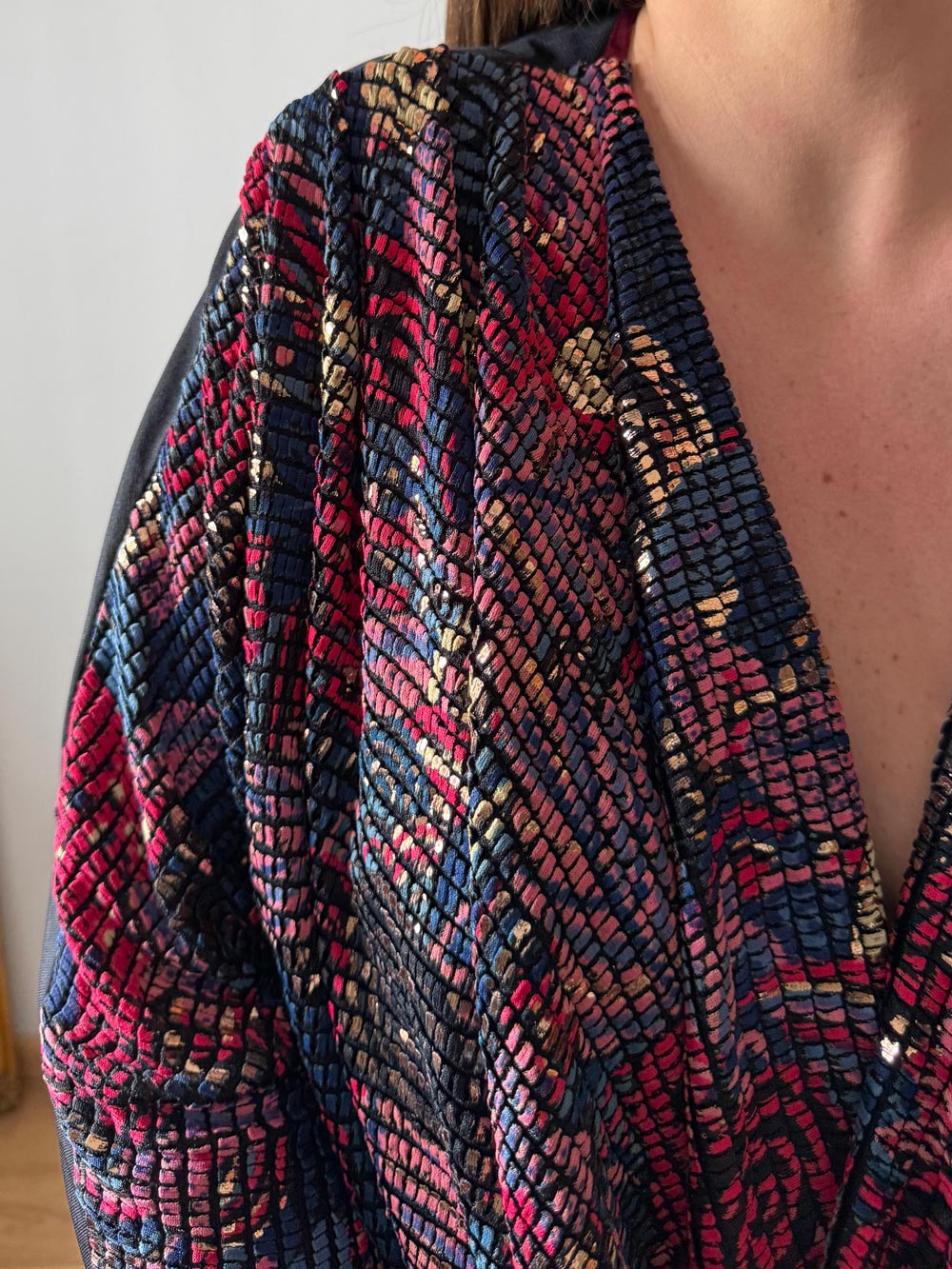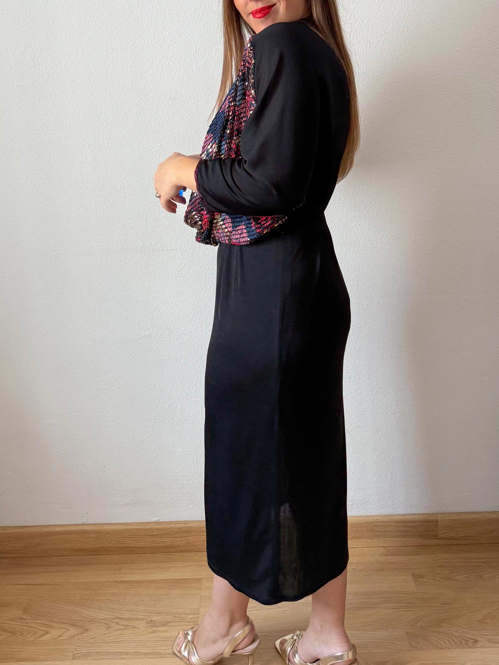 Vestido invitada vintage muy original. Mangas tipo murciélago con bonito colorido, tejido elástico, escote delantero y falda recta con abertura. Muy elegante y favorecedor.