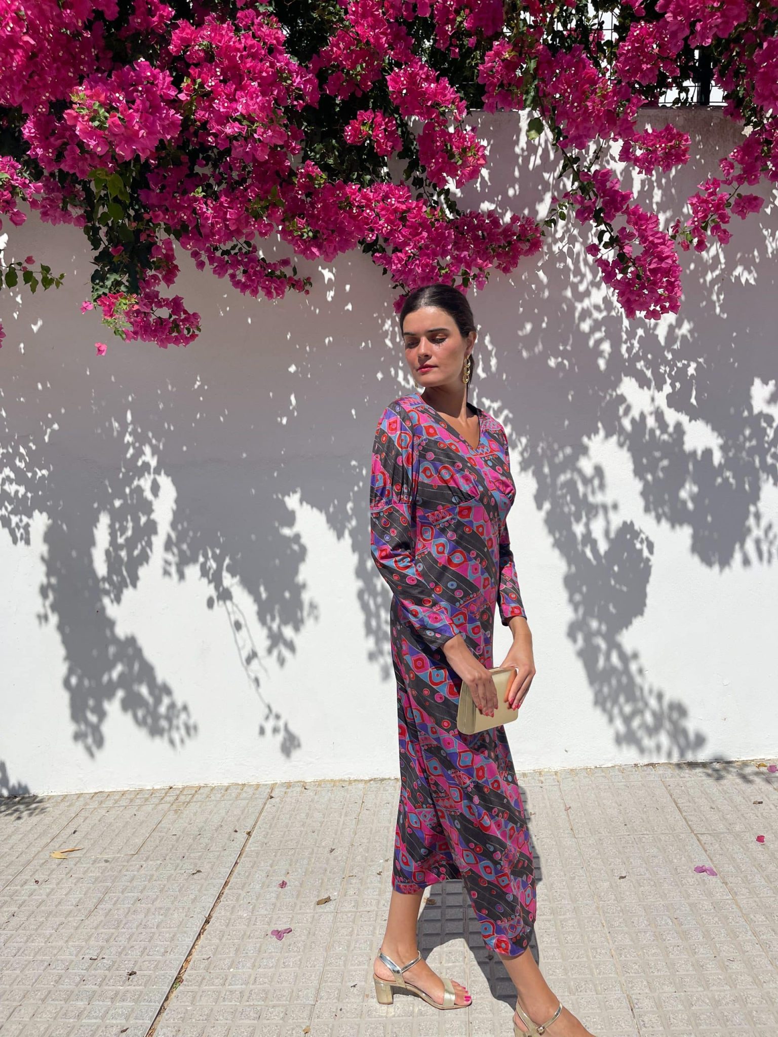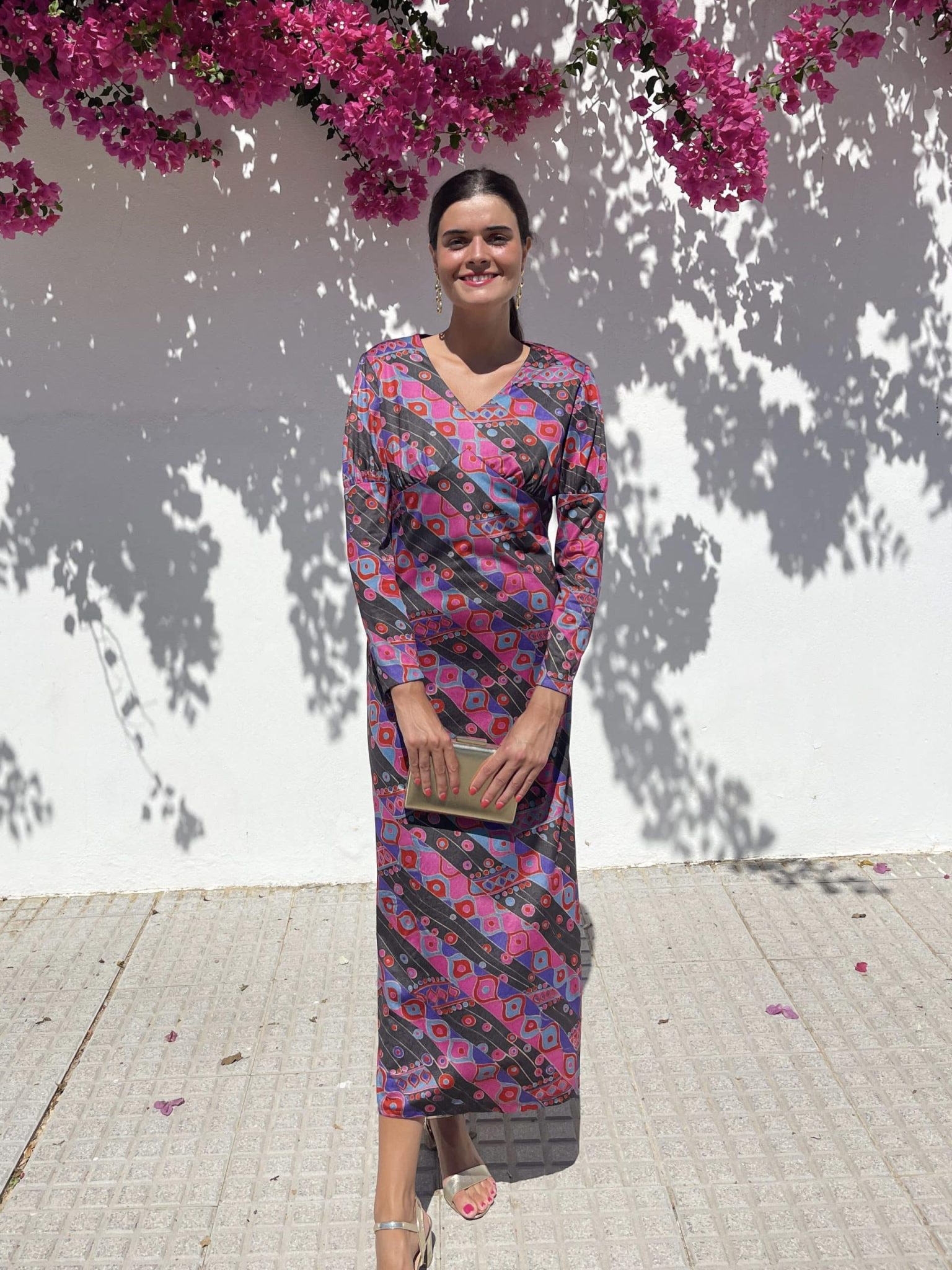 Vestido largo de fiesta con estampado geométrico en tonos fucsias, azules y negros. Tejido con ligero satinado. Fabricado en Italia.