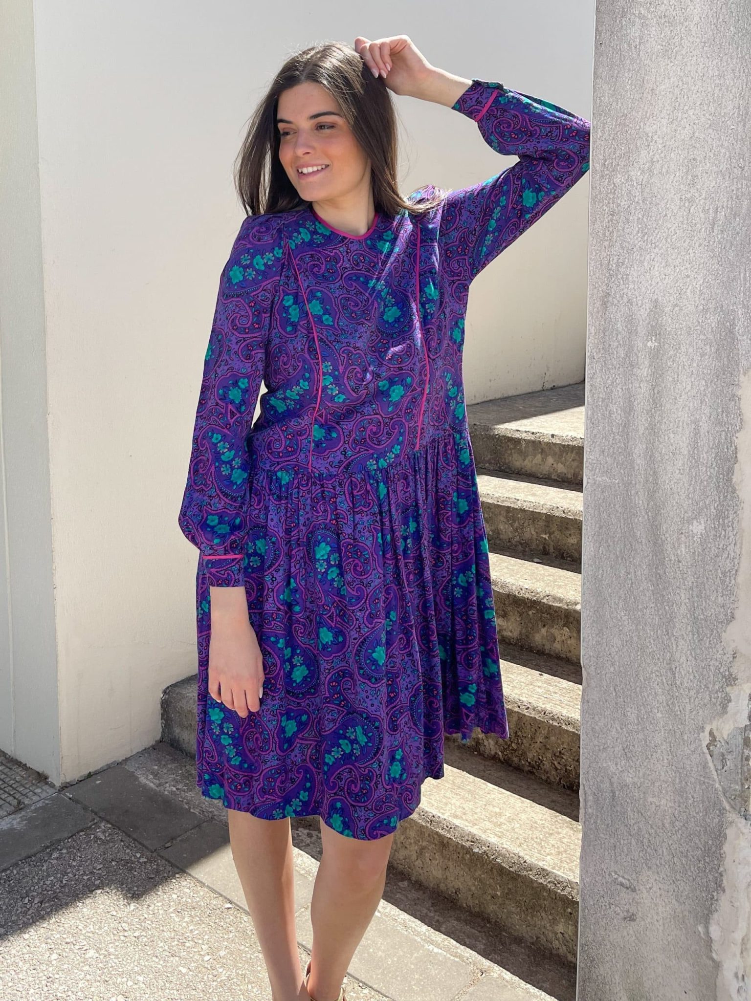 Vestido color morado combinado con ribetes en color fucsia y estampado floral en tonos turquesas. Escote redondo y falda con vuelo.